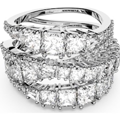 Intricate and opulent, this marvelous Swarovski ring reinterprets the spiral trend magnificently. Gently curving lines of white stones of various sizes in round, square, and tapered baguette-shapes sparkle brilliantly in many facets. Complemented by ...