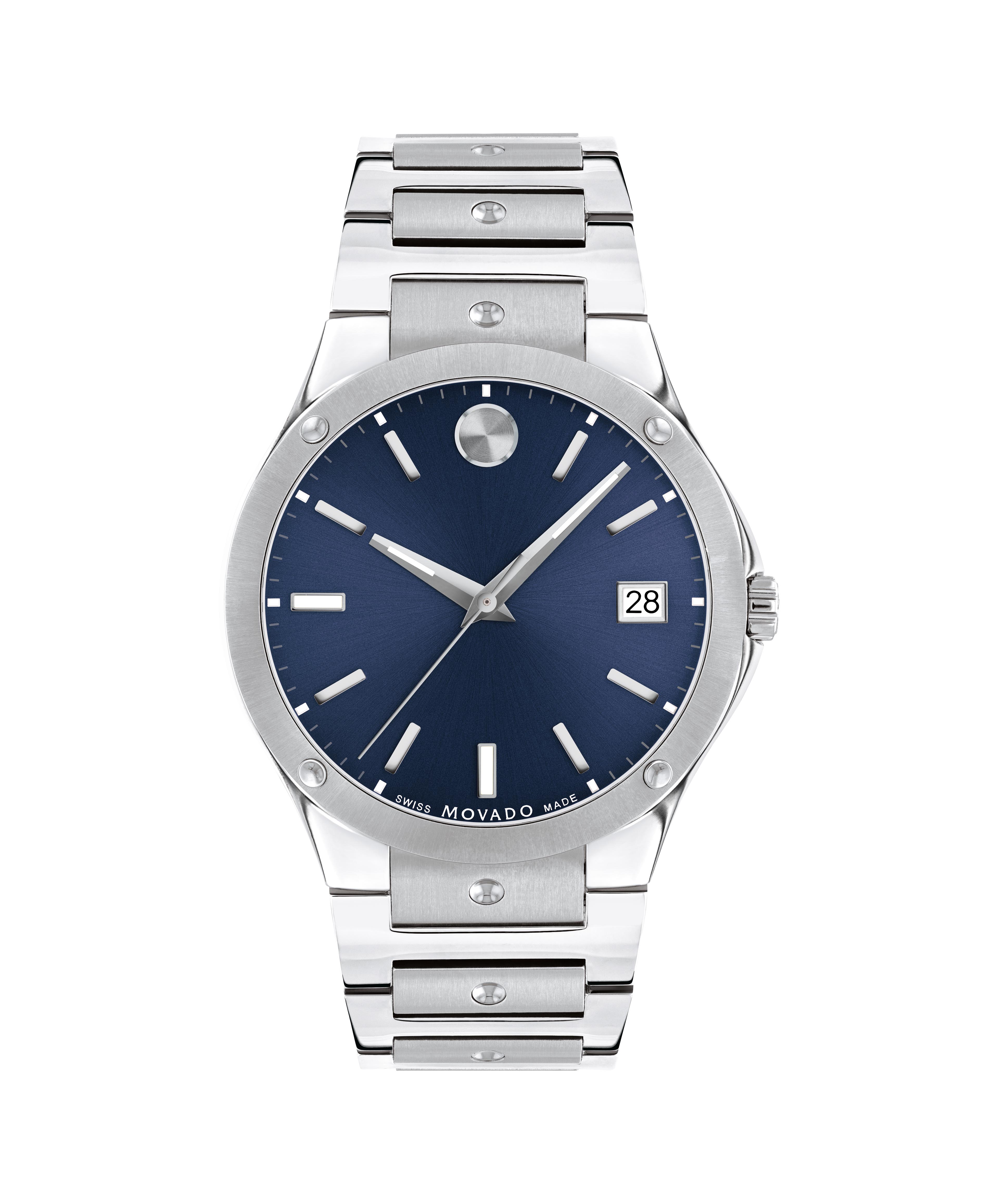 Movado S.E., 41mm dual finished stainless steel case and bracelet with silver concave polished dot accents and blue sunray dial. Features Sapphire crystal, date window detailing, and Swiss Super-LumiNova® hands, hour markers & indices at 6:00 and 9:...
