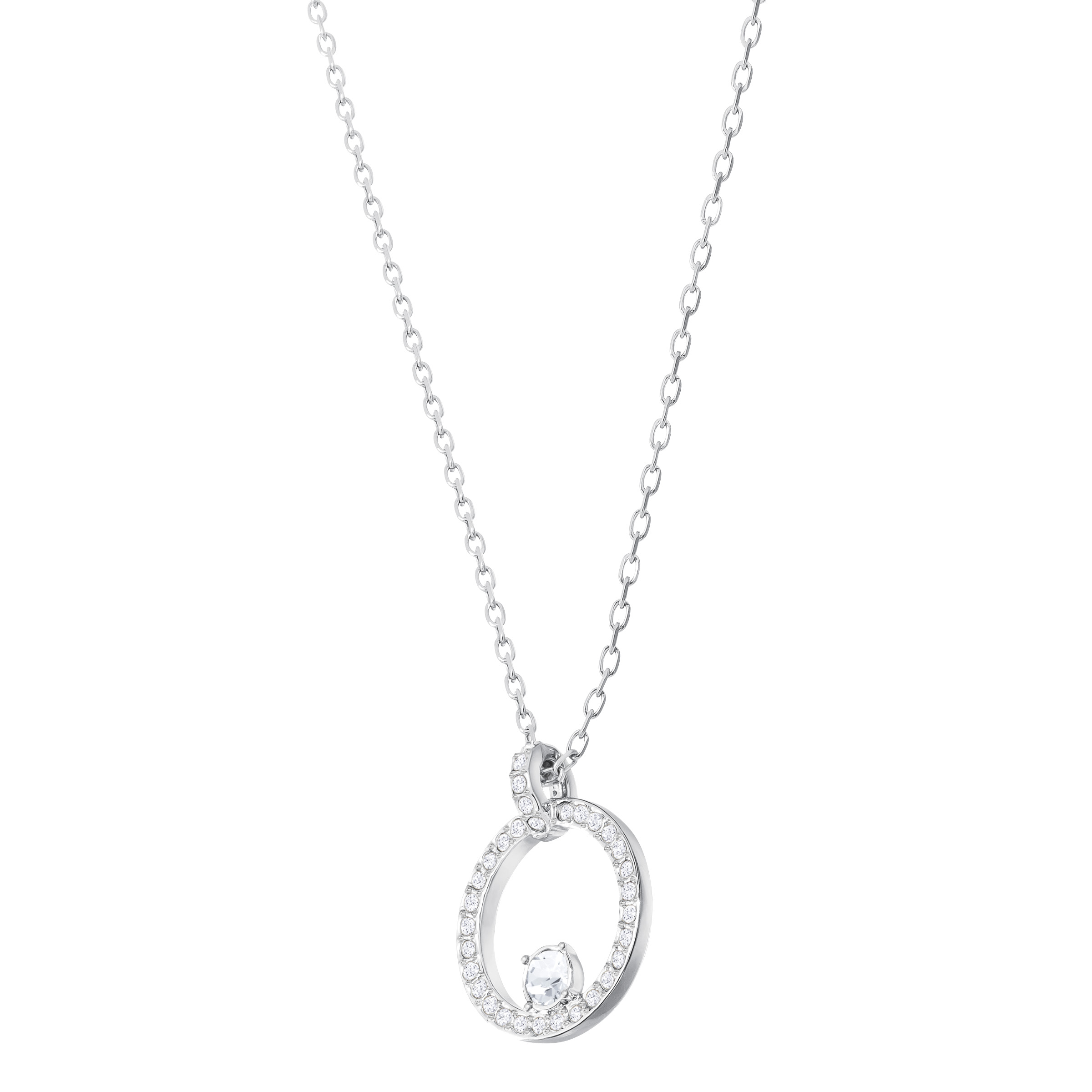 A stunning new interpretation of a timeless classic: the circle pendant. Highly refined, this design sparkles in clear crystal pavé. Rhodium-plated metal adds a modern touch. Wear with a longer pendant for an on-trend multi-length layered look. The ...