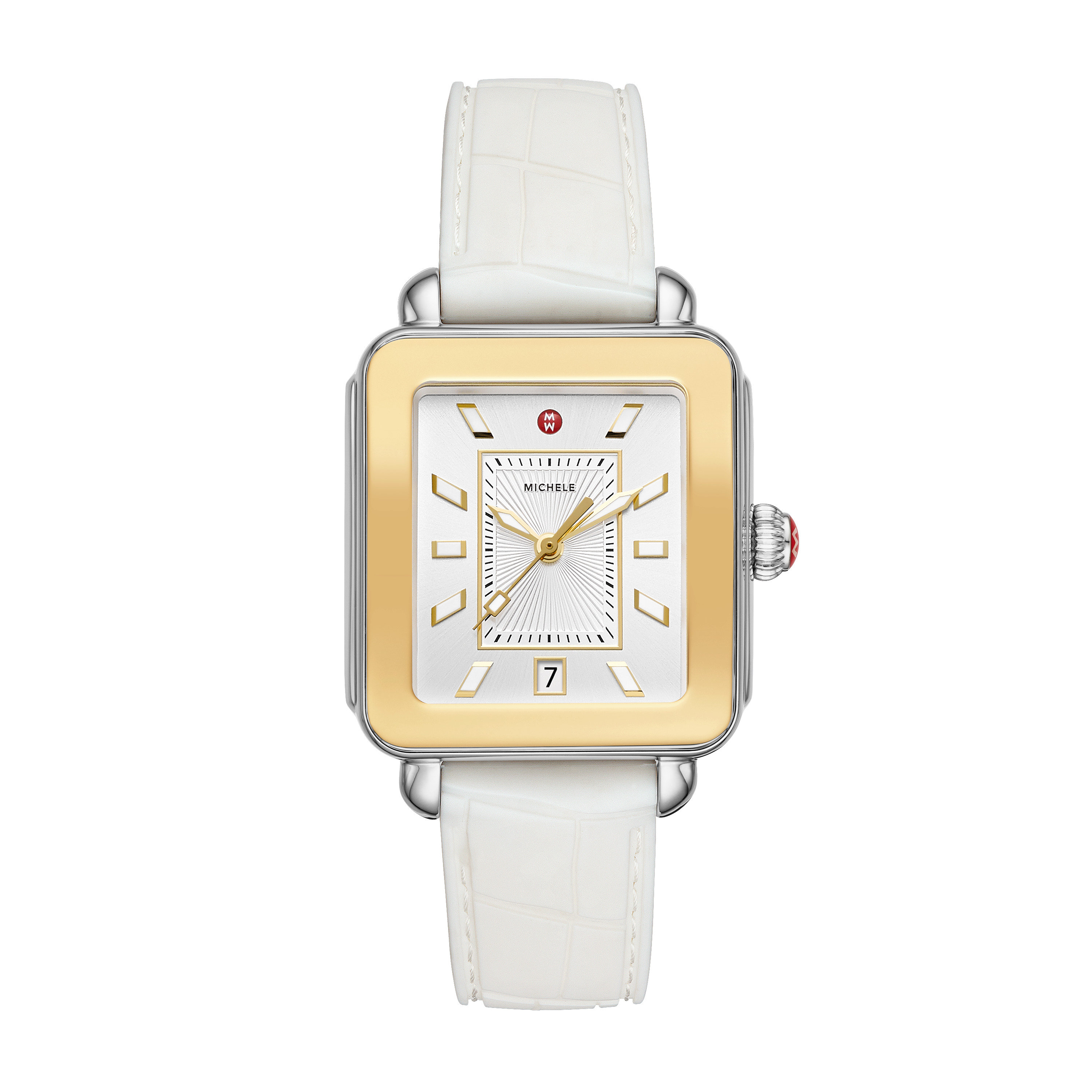 This two-tone Deco Sport offers a sporty, more casual take on the classic Deco with white lum-filled stick indexes on a silver white sunray dial and a gold-tone reflector bezel. The white embossed silicone strap is interchangeable with any 18mm MICHE...