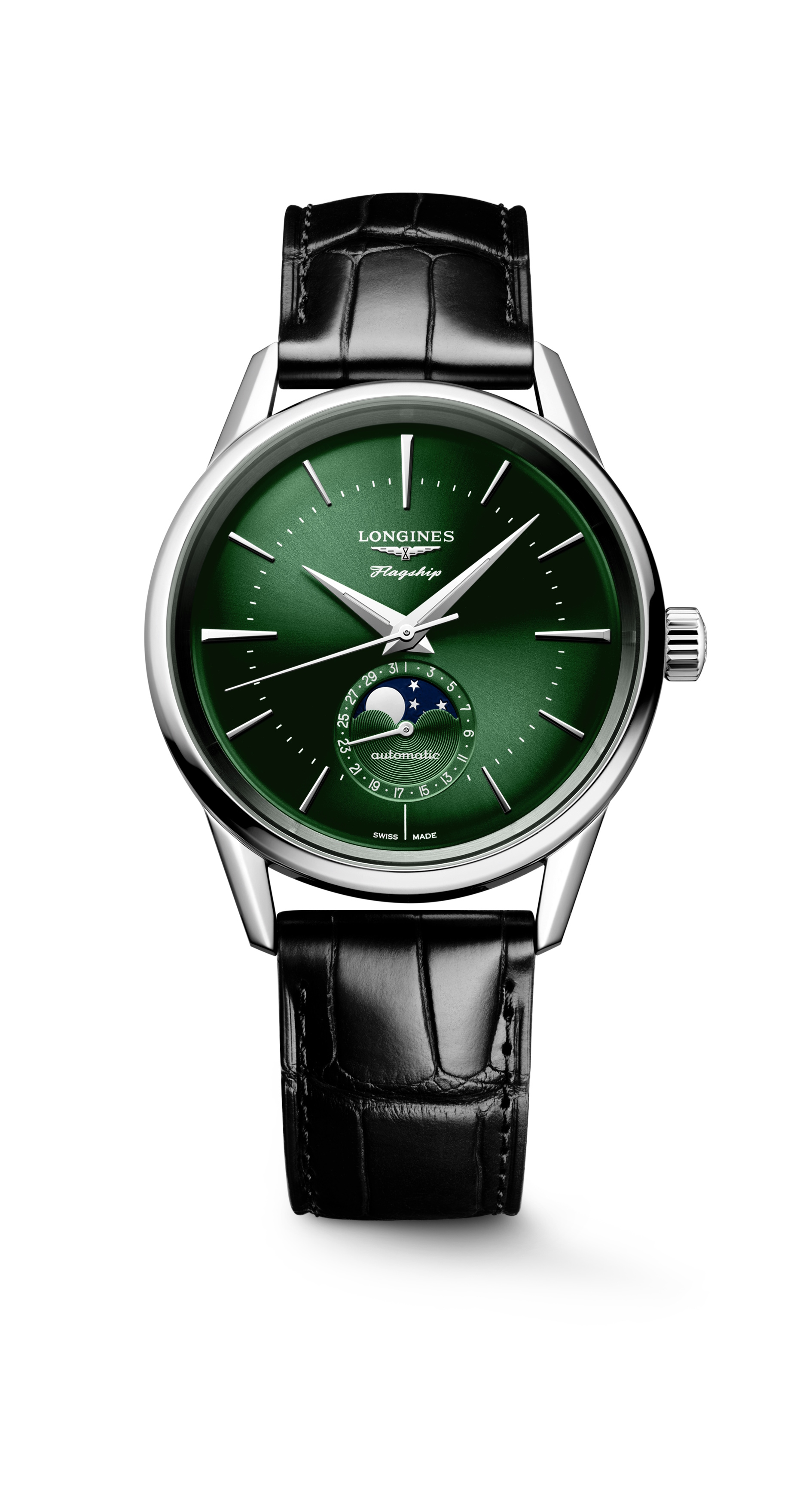 LONGINES FLAGSHIP HERITAGE MOONPHASE Sunray Green Dial Blk Lthr Strap