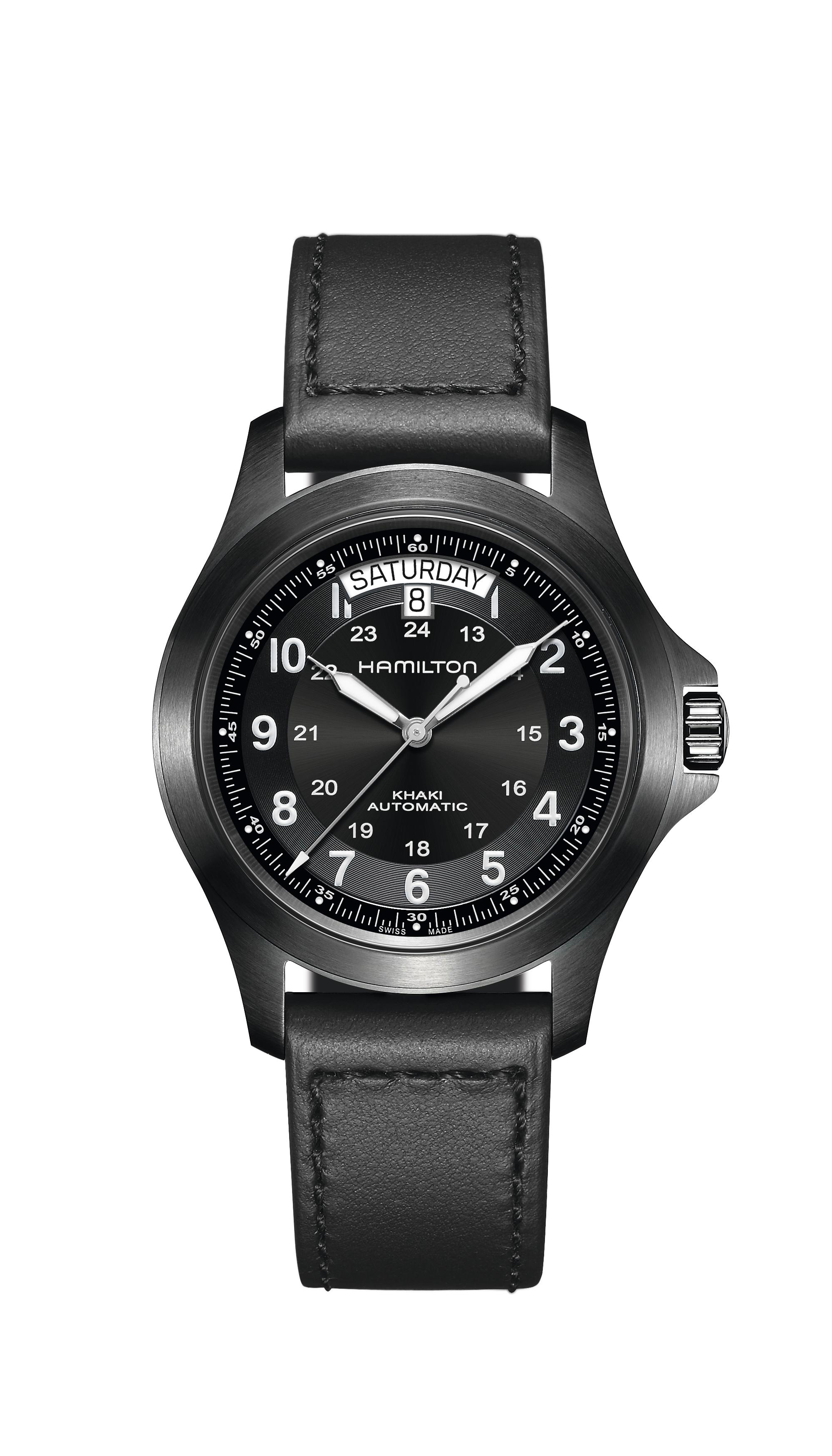 Inspired by Hamilton’s military heritage, our field watches are rugged and resilient. Perfect for after-dark heroics, the Khaki Field King Auto features a black PVD-coated case, black dial and black leather strap for the ultimate in stealth style. ...
