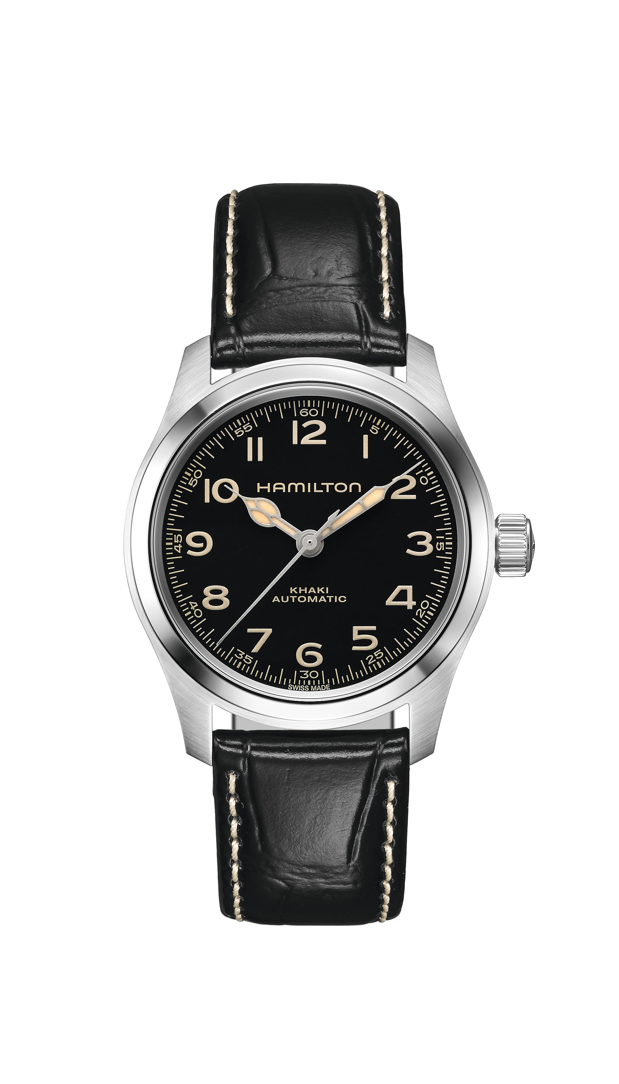 An iconic film favorite, the original Murph is now reimagined with a modern twist. Set on a black dial, the Khaki Field Murph's numerals are slightly domed, offering improved legibility, while the cathedral shaped hands give a vintage look to the tim...