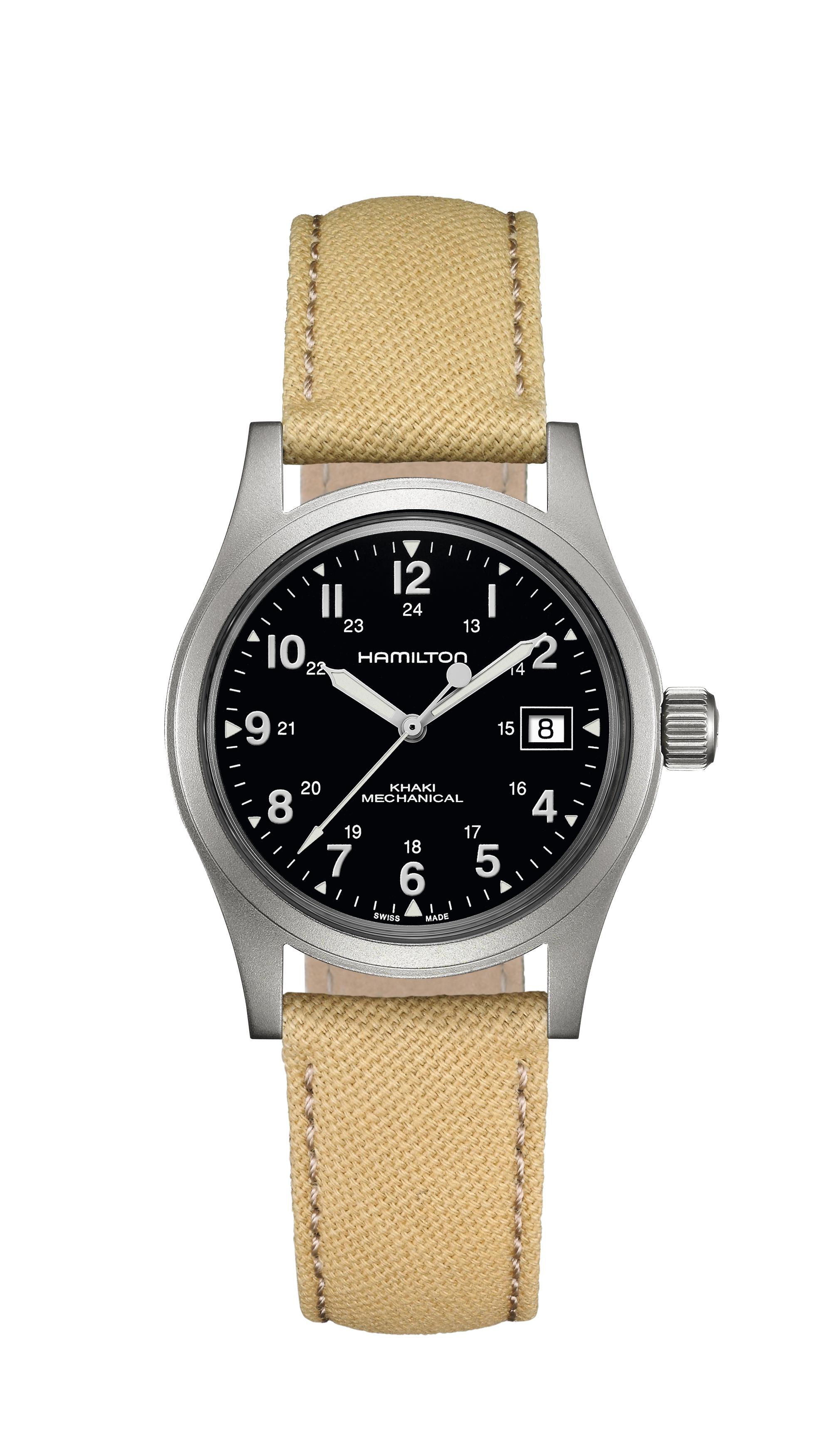 Small and mighty, the Khaki Field Mechanical is the ultimate companion when you're out in the field. Housed in a 38 mm stainless steel case, the matt white dial features contrasting black indexes and a Super-LumiNova® coating for optimal legibility....