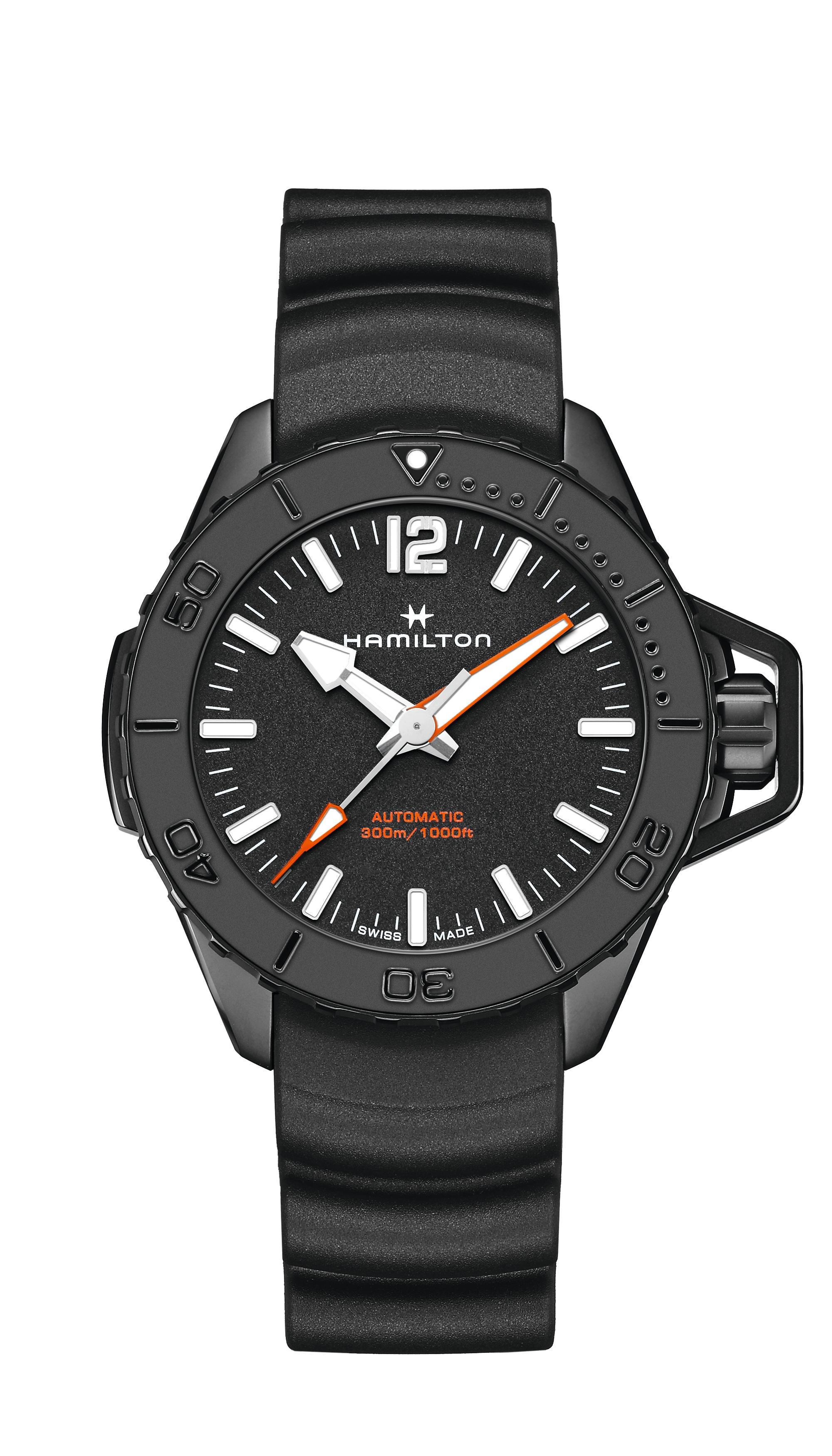 Worn by divers during WWII, and later in the 1951 drama “The Frogmen,” the original Hamilton Frogman was made to explore the deep. Our newest Khaki Navy Frogman Titanium features a titanium case, bare metal dial and red accents, and is lightweigh...
