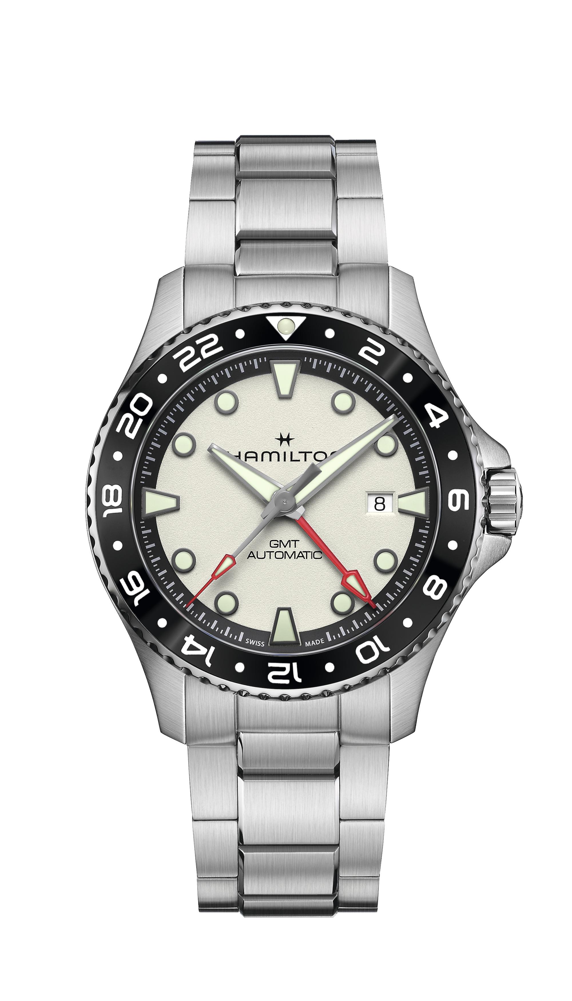 Designed for modern mariners and salty sea dogs, the Khaki Navy Automatic GMT is the ultimate traveler's watch, thanks to its precise timekeeping across multiple time zones. Boasting a stainless steel case with a brushed bracelet, the grained white d...