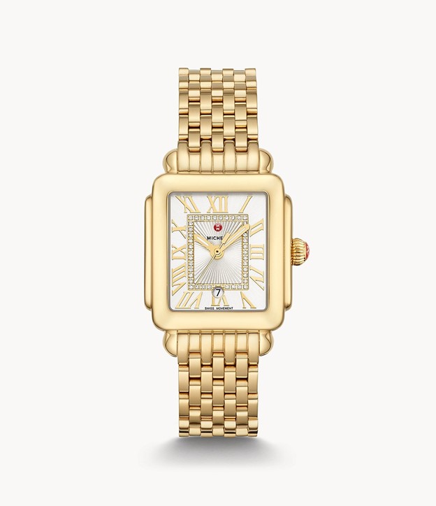 This 18K gold-plated Deco Madison Mid shines with 40 hand-set diamonds atop the silver white sunray dial. The gold bracelet is made specifically for the Deco Madison collection and is interchangeable with any 16mm Michele strap. Total Diamond Count:...