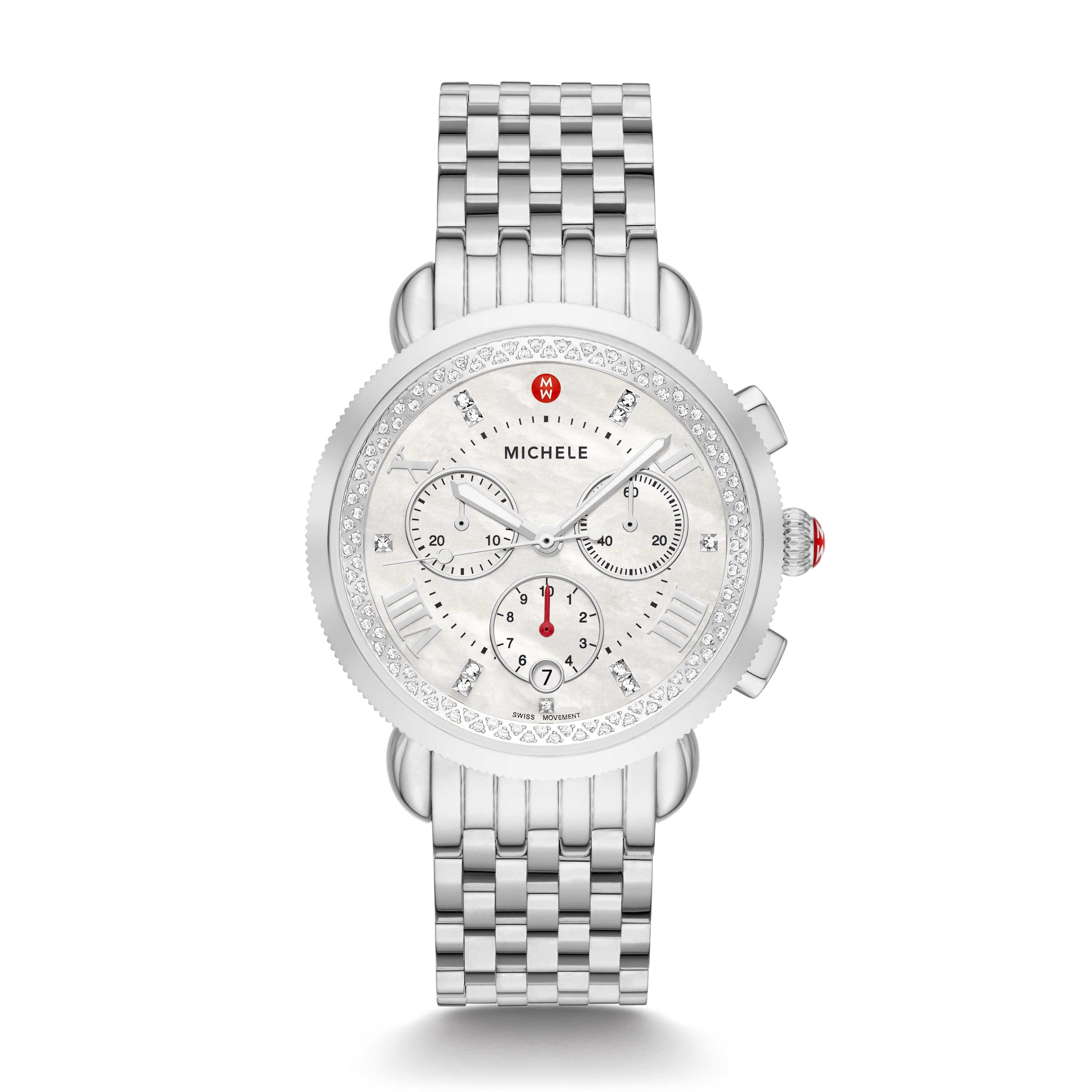 This stainless special edition Serein Mid watch features 134 hand-set diamonds atop a rounded bezel. Roman numerals and the signature Michele Logo grace the silver-white sunray dial. The 16mm stainless bracelet is made specifically for the Serein Mid...